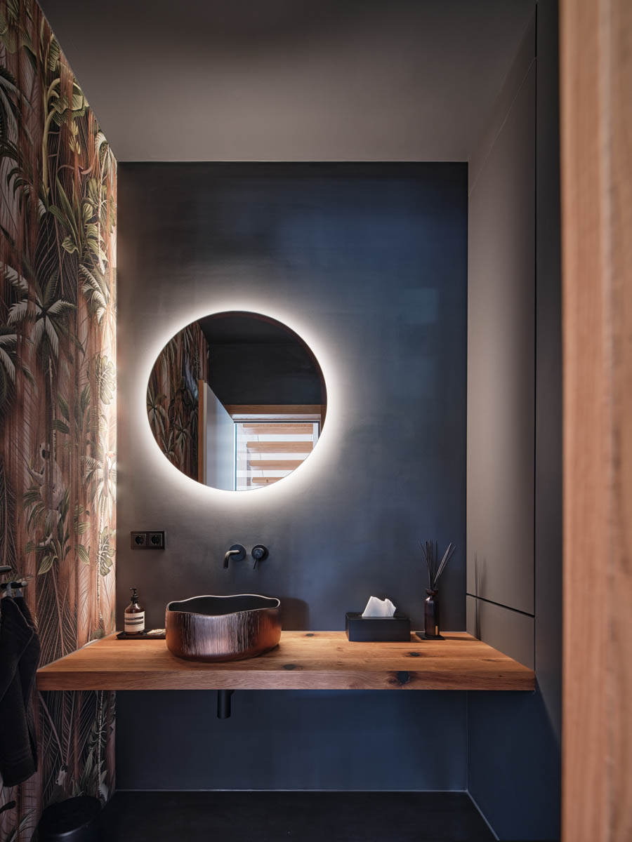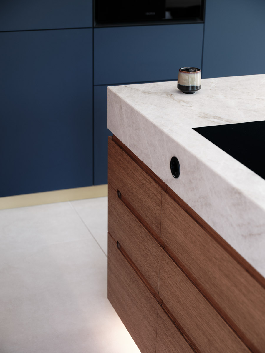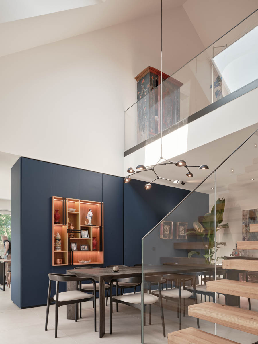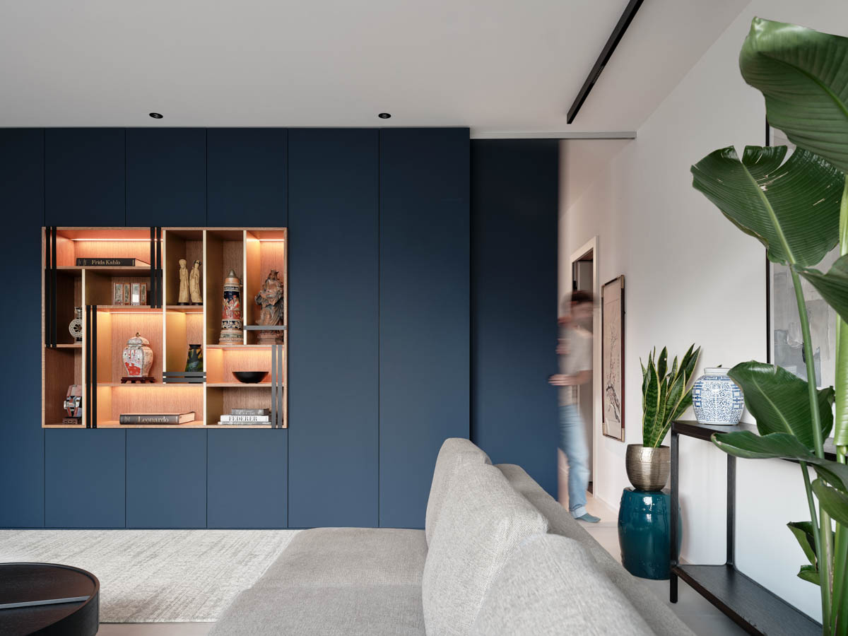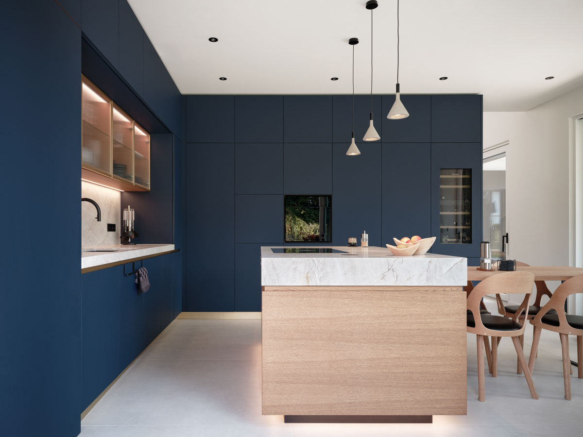 Einbaumöbel in Samt-Blau mit Akzenten in gebeizter Eiche und Gold. Der Entwurf basiert auf der Fusion amerikanischer und asiatischer Einrichtungsstile, woraus ein individuelles Konzept entwickelt wurde, das sich nahtlos ins Münchner Umland einfügt.